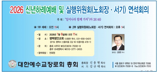 2026년 교단신년하례예배 및 실행위원회, 노회장 서기연석회의가 있음을 알려드립니다.