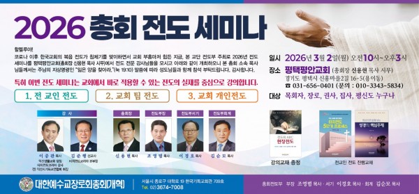 총회전도부 주관 2026 총회전도세미나가 2026년 3월 2일(월) 오전 10시에 평택평안교회(신용현 목사시무)에서 있어 안내해 드립니다.